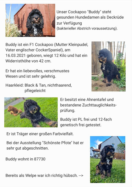 Empfohlene, untersuchte Deckrüden aus unserem Rassehundeverein: Hier Beispiel: Vom Toypudel, Zwergpudel, bis zum Mittelpudel (Kleinpudel) aus untersuchten und gesunden Linien. Die Rüden vererben verschiedene Farben. Sie haben ein ausgeglichenes, souveränes Wesen. Die Rüden sind untersucht auf alle rassetypischen Erbkrankheiten. Die untersuchten Rüden eignen sich für gesunde, reinrassige Pudelhündinen, aber auch für alle anderen, gesunden, untersuchten Fremdrassen um die beliebten \"Doodle\" oder \"Poo\" zu züchten. (Nur mit gesunden Elterntieren kann man auch gesunde Doodles züchten).